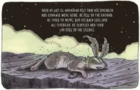 In the book, it is implied that El-ahrairah takes Hazel away, instead of the Black Rabbit of Inlé seen in the film and miniseries. This is supported by a mention of the rabbit's ears glowing a silver light. Aldo Galli, an illustrator chosen by Richard Adams, also painted this approach for the release of an illustrated version of Watership Down.[1] El-ahrairah also takes Hazel away in Watership Down: The Graphic Novel.