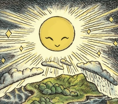 Long ago, Frith made the world. He made all the stars, too, and Earth is one of the stars. He made them by scattering his droppings all over the sky and this is why the grass and the trees grow so thick on the world. Frith makes the rivers flow. They follow him as he goes through the sky, and when he leaves the sky they look for him all night. Frith made all the animals and birds, but when he first made them they were all the same. The sparrow and the kestrel were friends and they both ate seeds and flies. And the fox and the rabbit were friends and they both ate grass. And there was plenty of grass and plenty of flies, because the world was new and Frith shone down bright and warmed all the world.